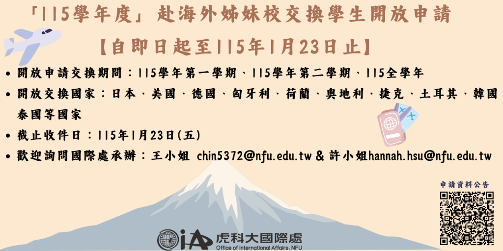 本處即日起開始受理申請「115學年度」赴海外姊妹校交換學生,各校申請條件請參閱簡章。